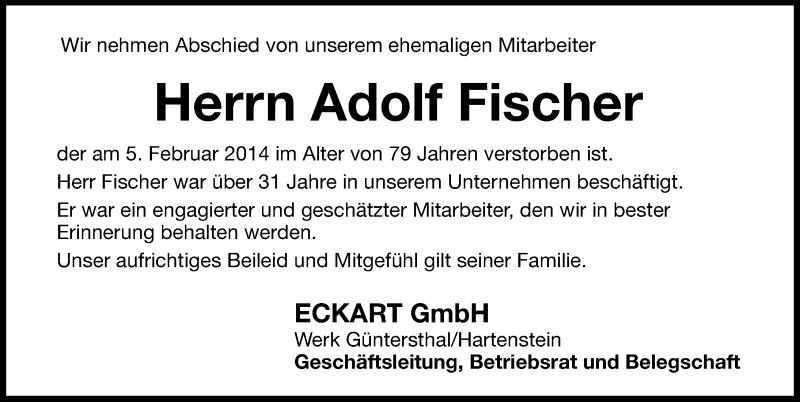 Hier finden Sie alle Traueranzeigen aus der Zeitung, die bisher für Adolf Fischer erschienen sind. Weitere Traueranzeigen, die in der Zeitung erscheinen, werden hier ebenfalls aufgelistet