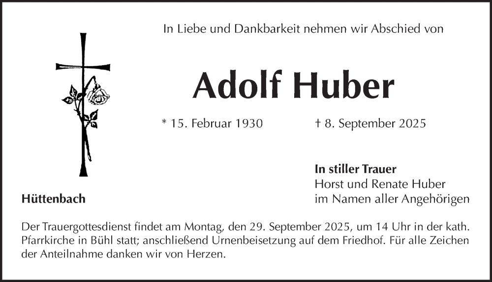 Hier finden Sie alle Traueranzeigen aus der Zeitung, die bisher für Adolf Huber erschienen sind. Weitere Traueranzeigen, die in der Zeitung erscheinen, werden hier ebenfalls aufgelistet