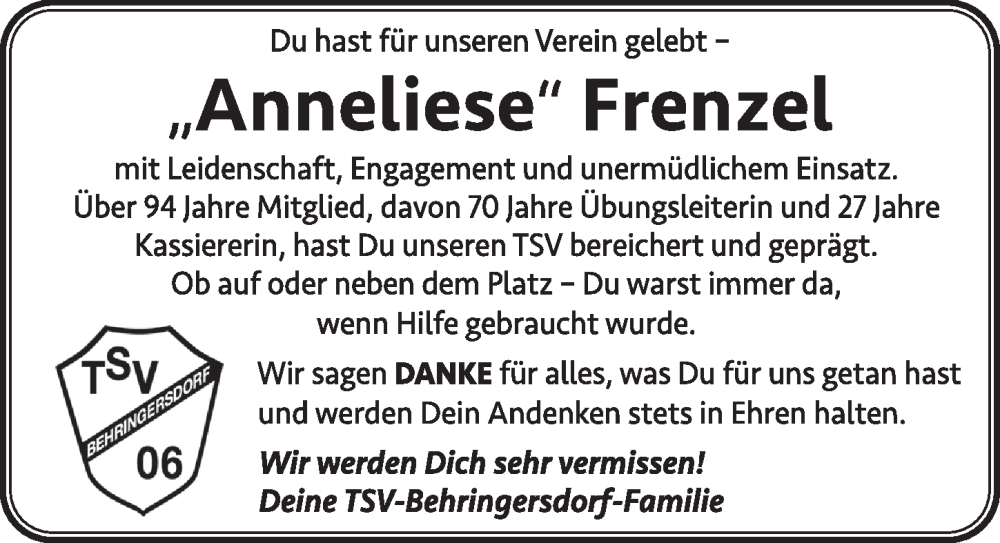 Hier finden Sie alle Traueranzeigen aus der Zeitung, die bisher für Anneliese Frenzel erschienen sind. Weitere Traueranzeigen, die in der Zeitung erscheinen, werden hier ebenfalls aufgelistet