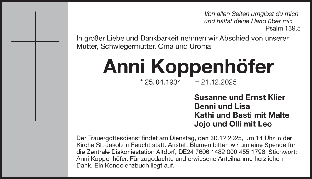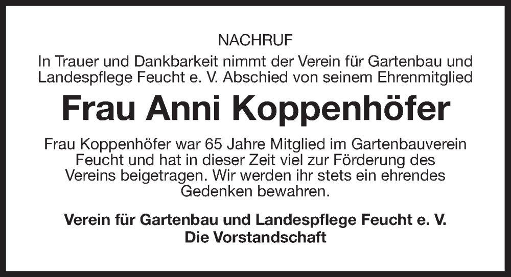 Hier finden Sie alle Traueranzeigen aus der Zeitung, die bisher für Anni Koppenhöfer erschienen sind. Weitere Traueranzeigen, die in der Zeitung erscheinen, werden hier ebenfalls aufgelistet