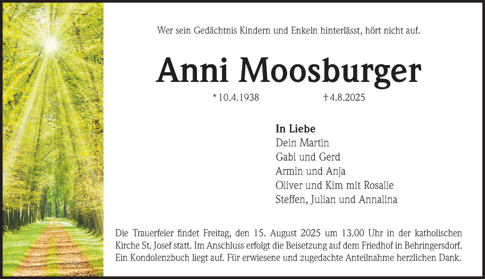 Hier finden Sie alle Traueranzeigen aus der Zeitung, die bisher für Anni Moosburger erschienen sind. Weitere Traueranzeigen, die in der Zeitung erscheinen, werden hier ebenfalls aufgelistet
