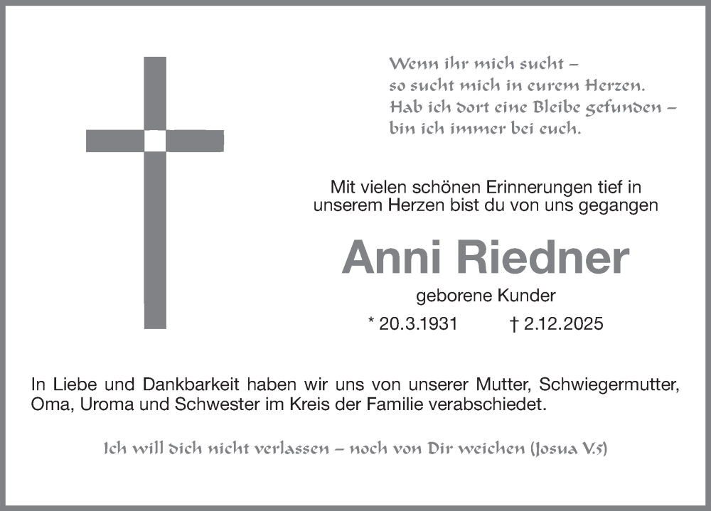Hier finden Sie alle Traueranzeigen aus der Zeitung, die bisher für Anni Riedner erschienen sind. Weitere Traueranzeigen, die in der Zeitung erscheinen, werden hier ebenfalls aufgelistet