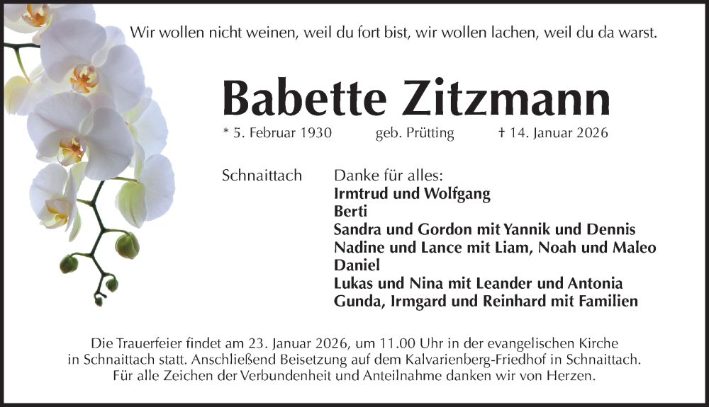 Hier finden Sie alle Traueranzeigen aus der Zeitung, die bisher für Babette Zitzmann erschienen sind. Weitere Traueranzeigen, die in der Zeitung erscheinen, werden hier ebenfalls aufgelistet