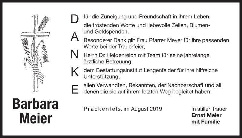 Hier finden Sie alle Traueranzeigen aus der Zeitung, die bisher für Barbara Meier erschienen sind. Weitere Traueranzeigen, die in der Zeitung erscheinen, werden hier ebenfalls aufgelistet