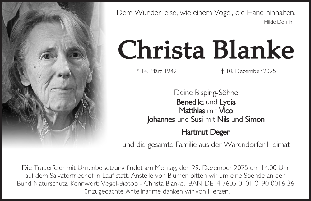 Hier finden Sie alle Traueranzeigen aus der Zeitung, die bisher für Christa Blanke erschienen sind. Weitere Traueranzeigen, die in der Zeitung erscheinen, werden hier ebenfalls aufgelistet