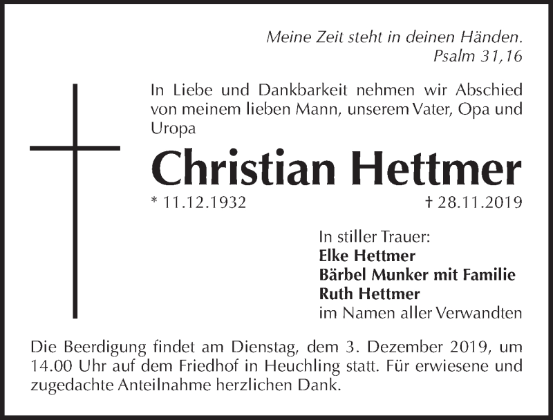Hier finden Sie alle Traueranzeigen aus der Zeitung, die bisher für Christian Hettmer erschienen sind. Weitere Traueranzeigen, die in der Zeitung erscheinen, werden hier ebenfalls aufgelistet