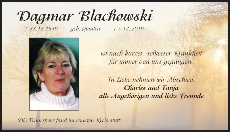 Hier finden Sie alle Traueranzeigen aus der Zeitung, die bisher für Dagmar Blachowski erschienen sind. Weitere Traueranzeigen, die in der Zeitung erscheinen, werden hier ebenfalls aufgelistet