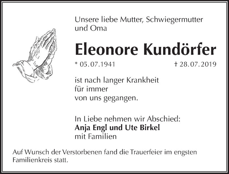 Hier finden Sie alle Traueranzeigen aus der Zeitung, die bisher für Eleonore Kundörfer erschienen sind. Weitere Traueranzeigen, die in der Zeitung erscheinen, werden hier ebenfalls aufgelistet