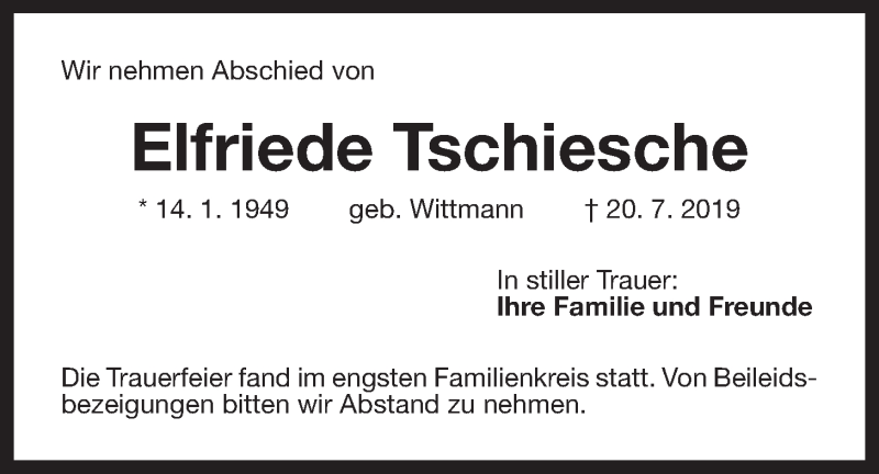 Hier finden Sie alle Traueranzeigen aus der Zeitung, die bisher für Elfriede Tschiesche erschienen sind. Weitere Traueranzeigen, die in der Zeitung erscheinen, werden hier ebenfalls aufgelistet