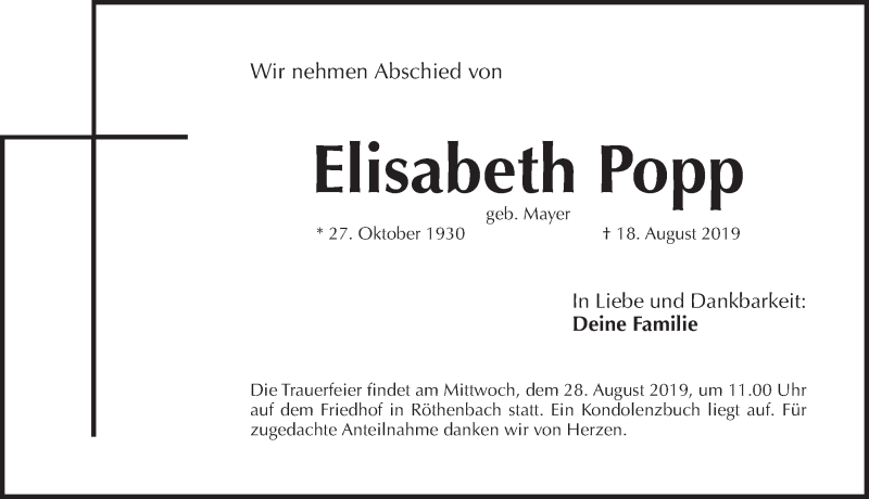 Hier finden Sie alle Traueranzeigen aus der Zeitung, die bisher für Elisabeth Popp erschienen sind. Weitere Traueranzeigen, die in der Zeitung erscheinen, werden hier ebenfalls aufgelistet