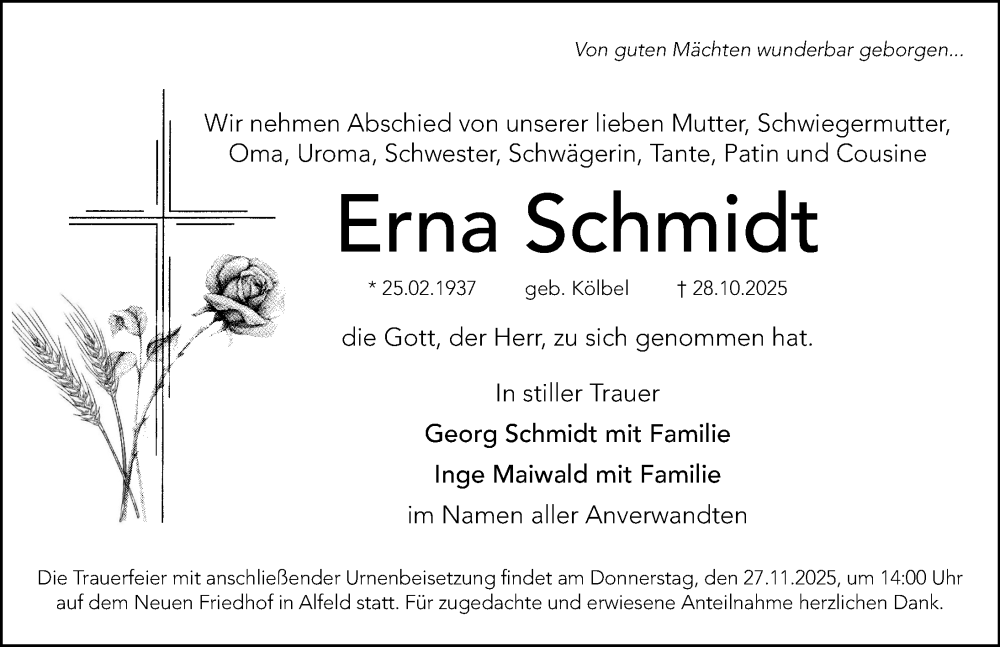 Hier finden Sie alle Traueranzeigen aus der Zeitung, die bisher für Erna Schmidt erschienen sind. Weitere Traueranzeigen, die in der Zeitung erscheinen, werden hier ebenfalls aufgelistet