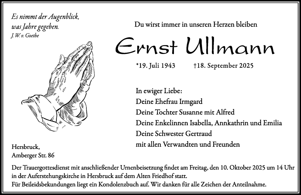 Hier finden Sie alle Traueranzeigen aus der Zeitung, die bisher für Ernst Ullmann erschienen sind. Weitere Traueranzeigen, die in der Zeitung erscheinen, werden hier ebenfalls aufgelistet