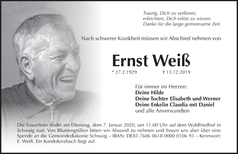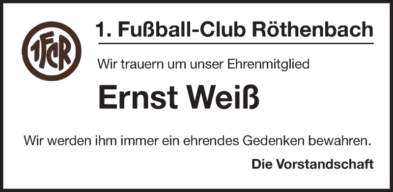 Hier finden Sie alle Traueranzeigen aus der Zeitung, die bisher für Ernst Weiß erschienen sind. Weitere Traueranzeigen, die in der Zeitung erscheinen, werden hier ebenfalls aufgelistet