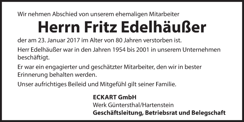 Hier finden Sie alle Traueranzeigen aus der Zeitung, die bisher für Fritz Edelhäußer erschienen sind. Weitere Traueranzeigen, die in der Zeitung erscheinen, werden hier ebenfalls aufgelistet