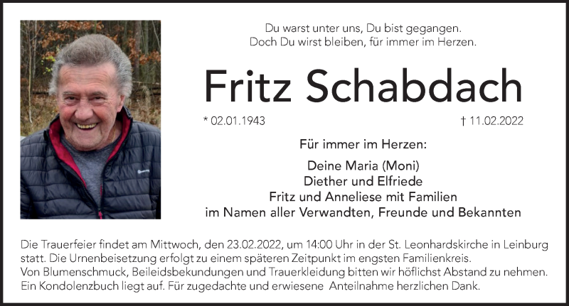 Hier finden Sie alle Traueranzeigen aus der Zeitung, die bisher für Fritz Schabdach erschienen sind. Weitere Traueranzeigen, die in der Zeitung erscheinen, werden hier ebenfalls aufgelistet