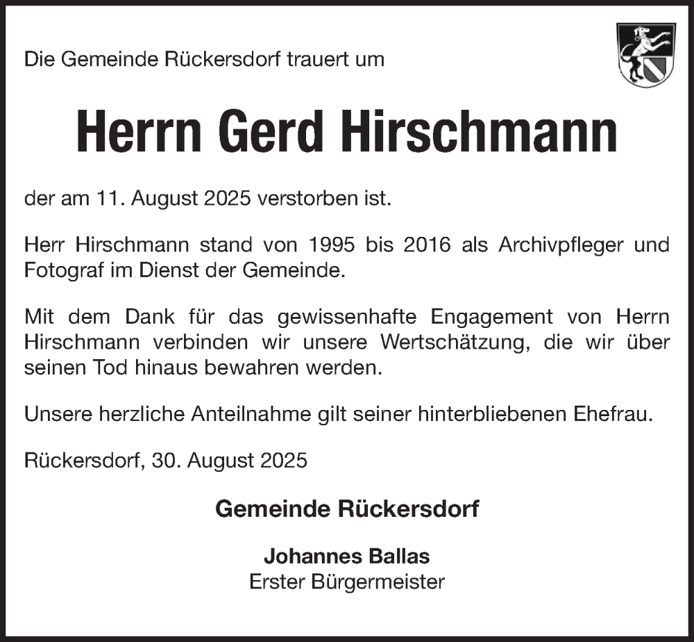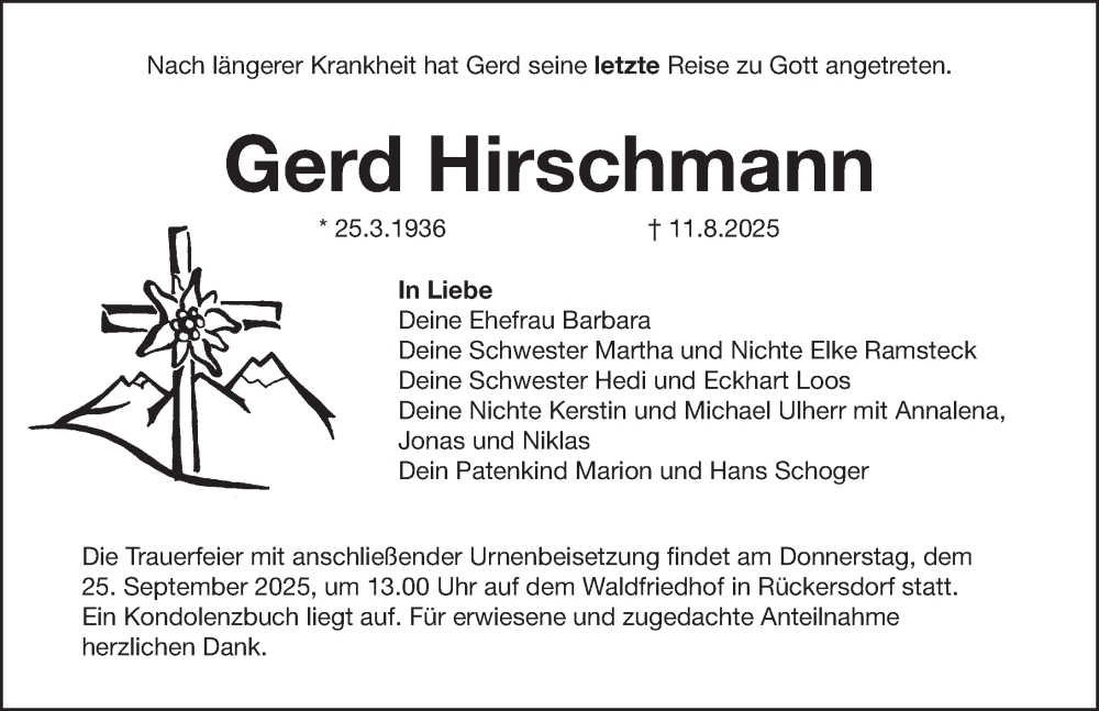 Hier finden Sie alle Traueranzeigen aus der Zeitung, die bisher für Gerd Hirschmann erschienen sind. Weitere Traueranzeigen, die in der Zeitung erscheinen, werden hier ebenfalls aufgelistet