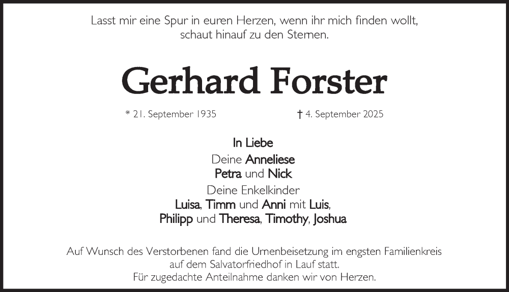 Hier finden Sie alle Traueranzeigen aus der Zeitung, die bisher für Gerhard Forster erschienen sind. Weitere Traueranzeigen, die in der Zeitung erscheinen, werden hier ebenfalls aufgelistet
