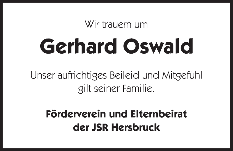 Hier finden Sie alle Traueranzeigen aus der Zeitung, die bisher für Gerhard Oswald erschienen sind. Weitere Traueranzeigen, die in der Zeitung erscheinen, werden hier ebenfalls aufgelistet