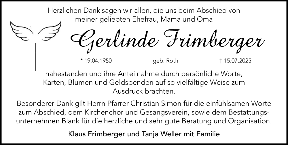 Hier finden Sie alle Traueranzeigen aus der Zeitung, die bisher für Gerlinde Frimberger erschienen sind. Weitere Traueranzeigen, die in der Zeitung erscheinen, werden hier ebenfalls aufgelistet