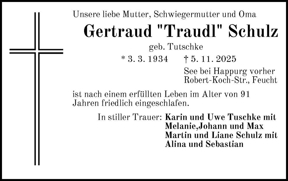 Hier finden Sie alle Traueranzeigen aus der Zeitung, die bisher für Gertraud Schulz erschienen sind. Weitere Traueranzeigen, die in der Zeitung erscheinen, werden hier ebenfalls aufgelistet