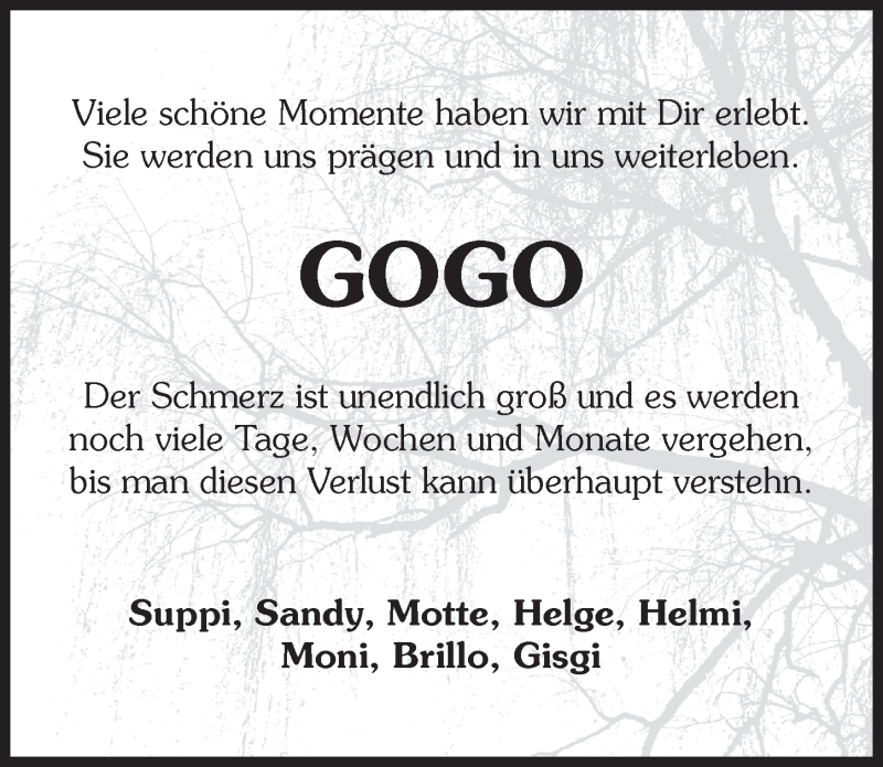 Hier finden Sie alle Traueranzeigen aus der Zeitung, die bisher für Gogo erschienen sind. Weitere Traueranzeigen, die in der Zeitung erscheinen, werden hier ebenfalls aufgelistet