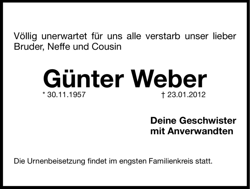 Hier finden Sie alle Traueranzeigen aus der Zeitung, die bisher für Günter Weber erschienen sind. Weitere Traueranzeigen, die in der Zeitung erscheinen, werden hier ebenfalls aufgelistet