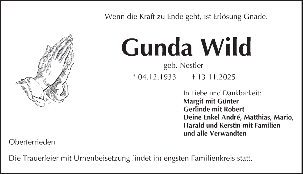 Hier finden Sie alle Traueranzeigen aus der Zeitung, die bisher für Gunda Wild erschienen sind. Weitere Traueranzeigen, die in der Zeitung erscheinen, werden hier ebenfalls aufgelistet