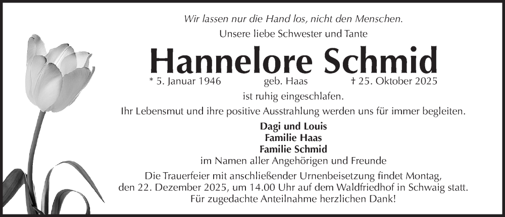 Hier finden Sie alle Traueranzeigen aus der Zeitung, die bisher für Hannelore Schmid erschienen sind. Weitere Traueranzeigen, die in der Zeitung erscheinen, werden hier ebenfalls aufgelistet