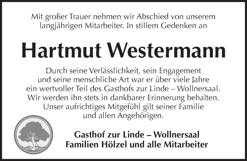 Hier finden Sie alle Traueranzeigen aus der Zeitung, die bisher für Hartmut Westermann erschienen sind. Weitere Traueranzeigen, die in der Zeitung erscheinen, werden hier ebenfalls aufgelistet