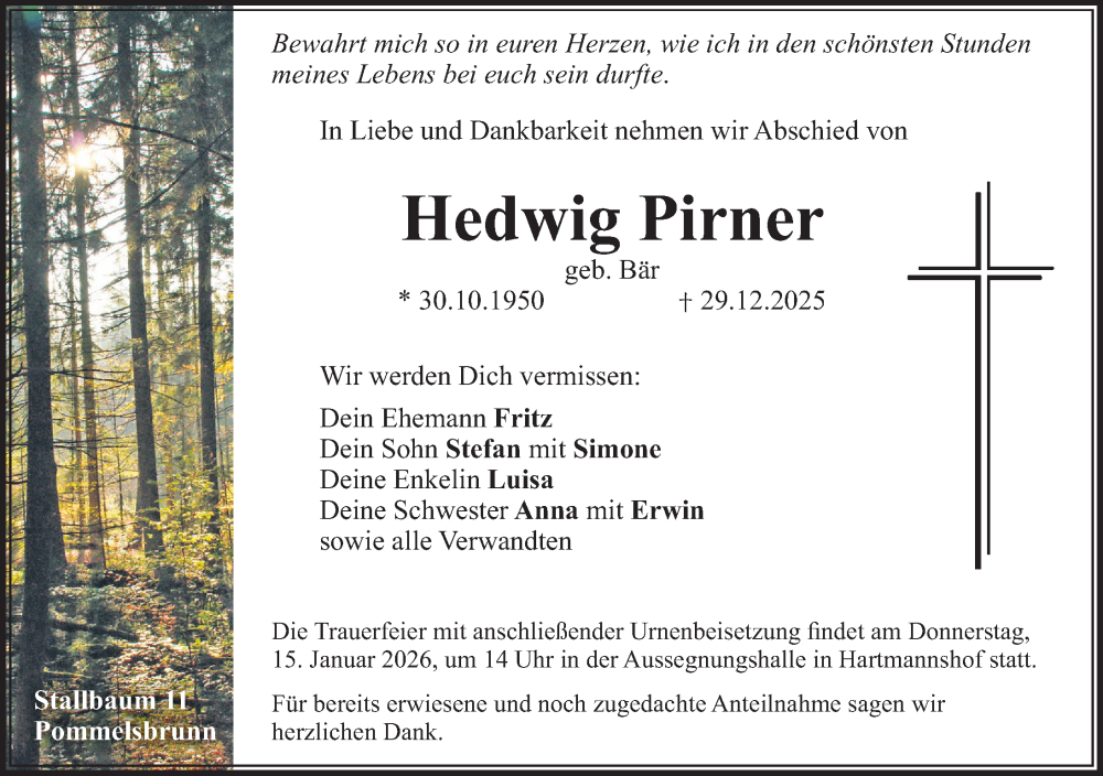Hier finden Sie alle Traueranzeigen aus der Zeitung, die bisher für Hedwig Pirner erschienen sind. Weitere Traueranzeigen, die in der Zeitung erscheinen, werden hier ebenfalls aufgelistet