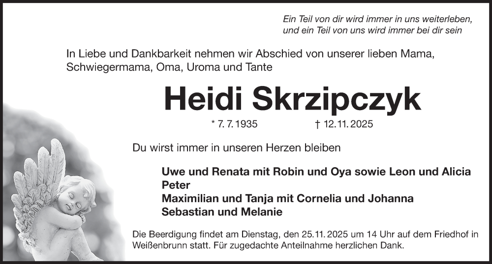 Hier finden Sie alle Traueranzeigen aus der Zeitung, die bisher für Heidi Skrzipczyk erschienen sind. Weitere Traueranzeigen, die in der Zeitung erscheinen, werden hier ebenfalls aufgelistet