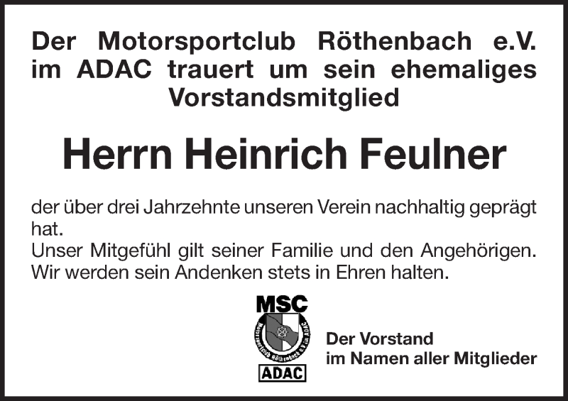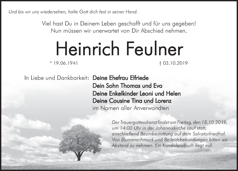 Hier finden Sie alle Traueranzeigen aus der Zeitung, die bisher für Heinrich Feulner erschienen sind. Weitere Traueranzeigen, die in der Zeitung erscheinen, werden hier ebenfalls aufgelistet