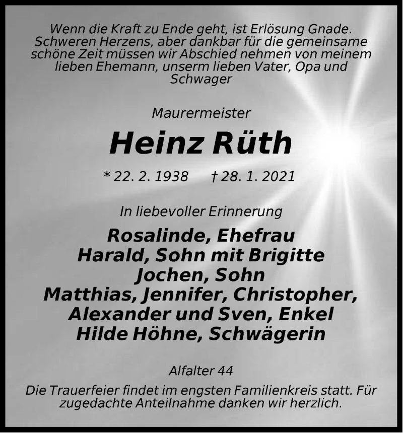 Hier finden Sie alle Traueranzeigen aus der Zeitung, die bisher für Heinz Ruth erschienen sind. Weitere Traueranzeigen, die in der Zeitung erscheinen, werden hier ebenfalls aufgelistet