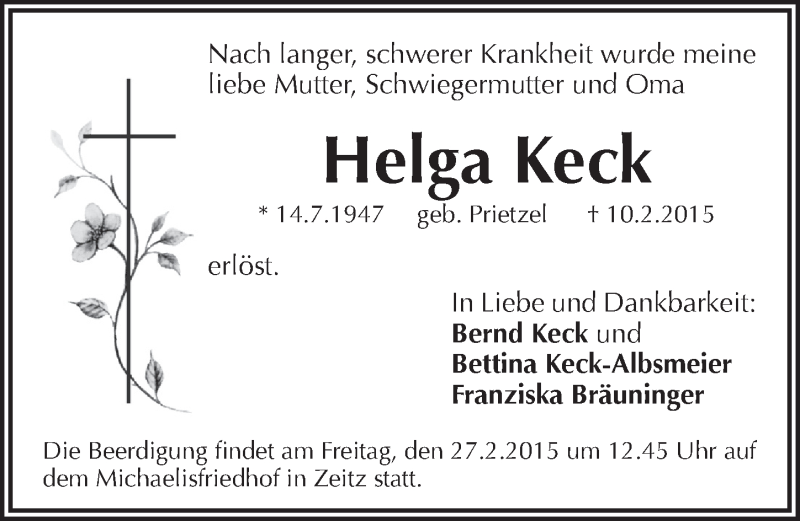 Hier finden Sie alle Traueranzeigen aus der Zeitung, die bisher für Helga Keck erschienen sind. Weitere Traueranzeigen, die in der Zeitung erscheinen, werden hier ebenfalls aufgelistet