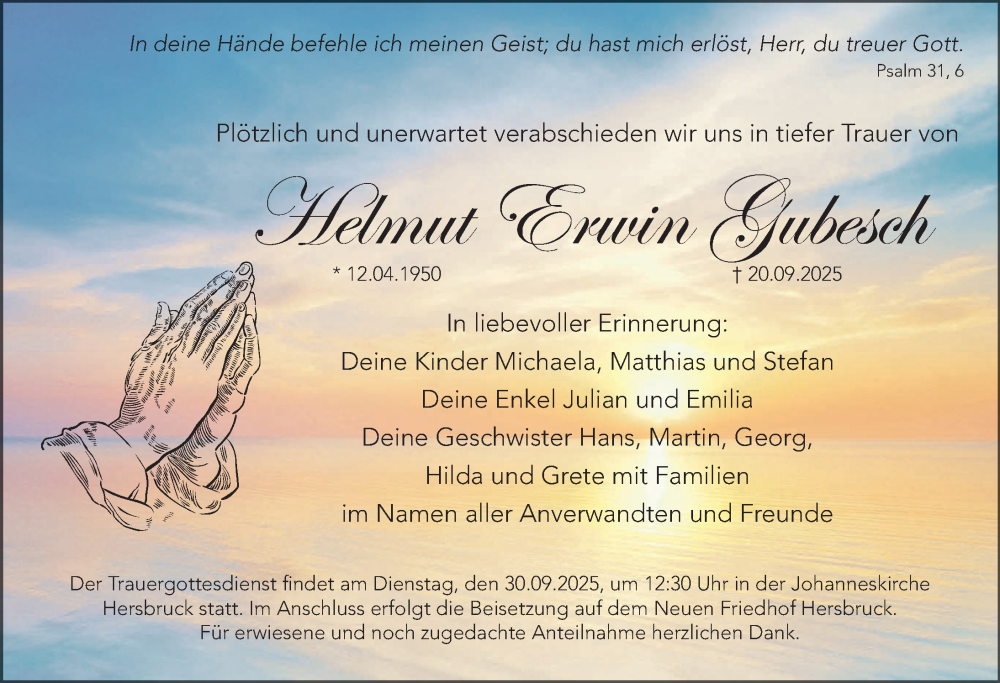 Hier finden Sie alle Traueranzeigen aus der Zeitung, die bisher für Helmut Erwin Gubesch erschienen sind. Weitere Traueranzeigen, die in der Zeitung erscheinen, werden hier ebenfalls aufgelistet