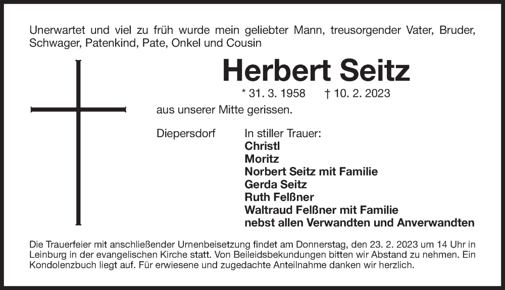 Hier finden Sie alle Traueranzeigen aus der Zeitung, die bisher für Herbert Seitz erschienen sind. Weitere Traueranzeigen, die in der Zeitung erscheinen, werden hier ebenfalls aufgelistet