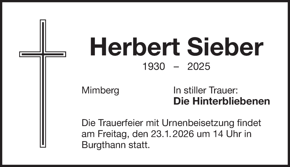 Hier finden Sie alle Traueranzeigen aus der Zeitung, die bisher für Herbert Sieber erschienen sind. Weitere Traueranzeigen, die in der Zeitung erscheinen, werden hier ebenfalls aufgelistet