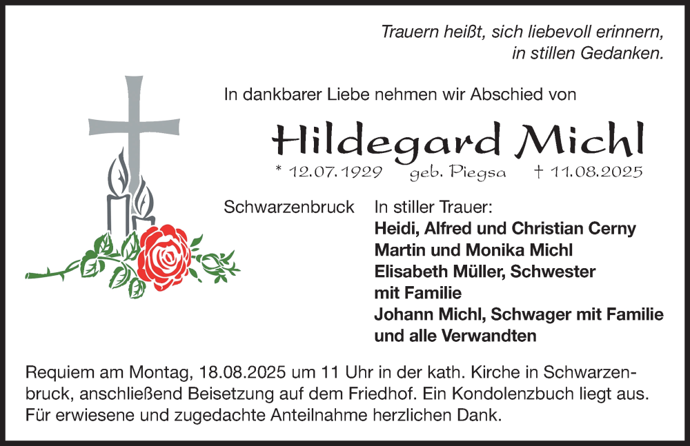 Hier finden Sie alle Traueranzeigen aus der Zeitung, die bisher für Hildegard Michl erschienen sind. Weitere Traueranzeigen, die in der Zeitung erscheinen, werden hier ebenfalls aufgelistet