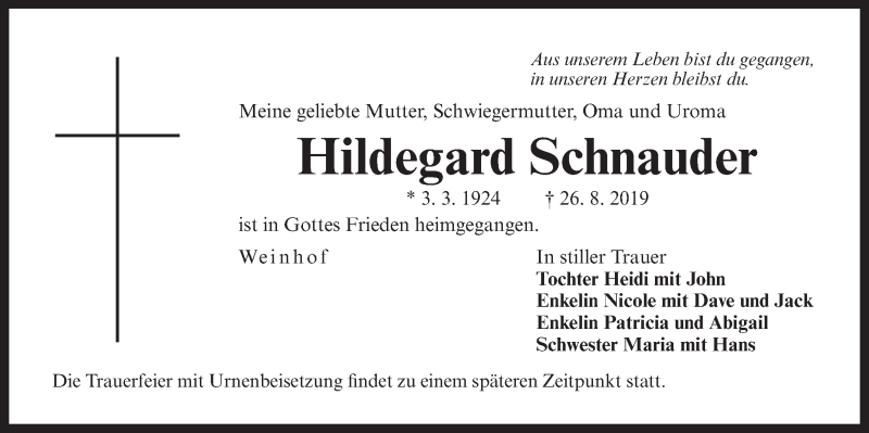 Hier finden Sie alle Traueranzeigen aus der Zeitung, die bisher für Hildegard Schnauder erschienen sind. Weitere Traueranzeigen, die in der Zeitung erscheinen, werden hier ebenfalls aufgelistet