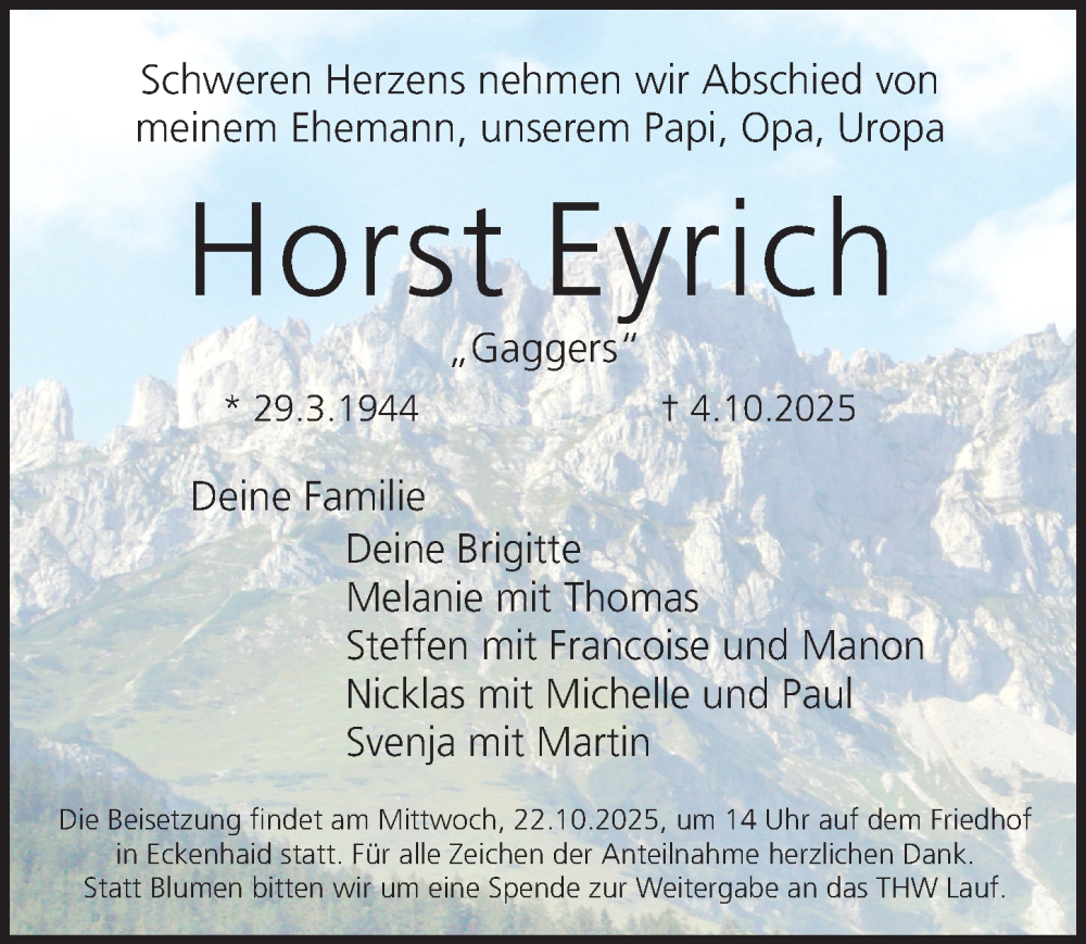 Hier finden Sie alle Traueranzeigen aus der Zeitung, die bisher für Horst Eyrich erschienen sind. Weitere Traueranzeigen, die in der Zeitung erscheinen, werden hier ebenfalls aufgelistet