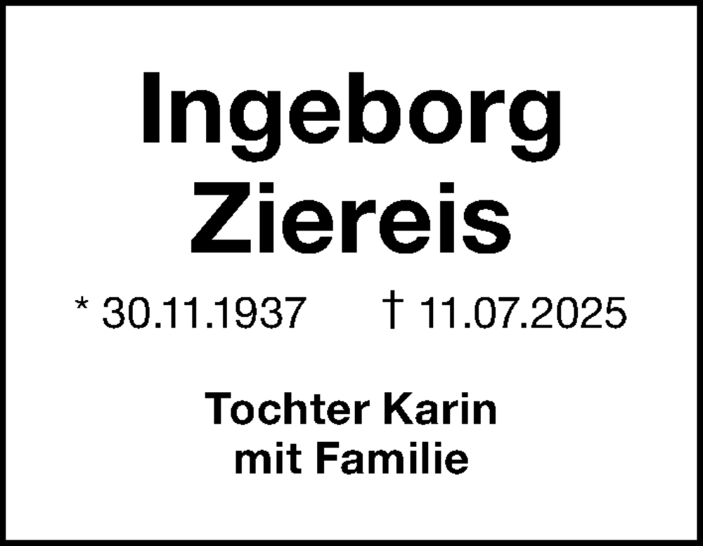 Hier finden Sie alle Traueranzeigen aus der Zeitung, die bisher für Ingeborg Ziereis erschienen sind. Weitere Traueranzeigen, die in der Zeitung erscheinen, werden hier ebenfalls aufgelistet