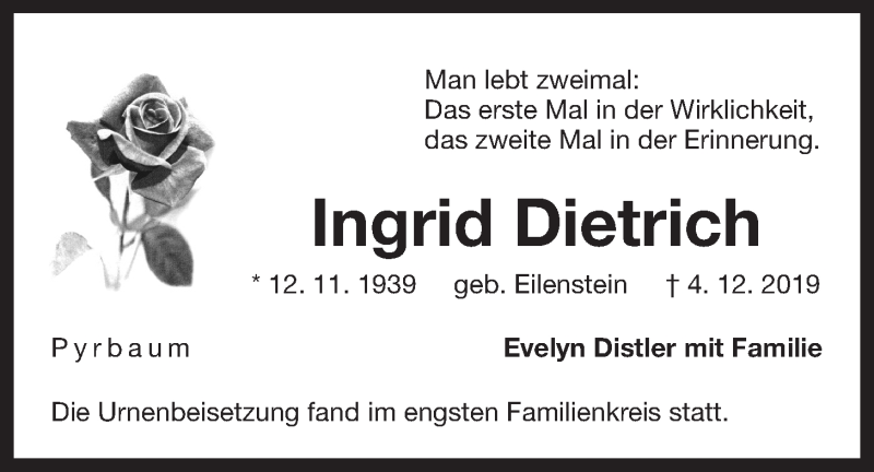 Hier finden Sie alle Traueranzeigen aus der Zeitung, die bisher für Ingrid Dietrich erschienen sind. Weitere Traueranzeigen, die in der Zeitung erscheinen, werden hier ebenfalls aufgelistet