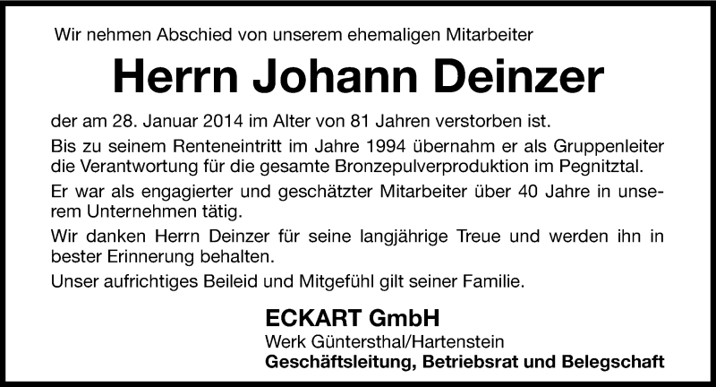 Hier finden Sie alle Traueranzeigen aus der Zeitung, die bisher für Johann Deinzer erschienen sind. Weitere Traueranzeigen, die in der Zeitung erscheinen, werden hier ebenfalls aufgelistet