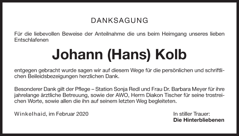 Hier finden Sie alle Traueranzeigen aus der Zeitung, die bisher für Johann Kolb erschienen sind. Weitere Traueranzeigen, die in der Zeitung erscheinen, werden hier ebenfalls aufgelistet