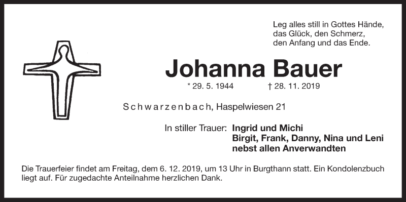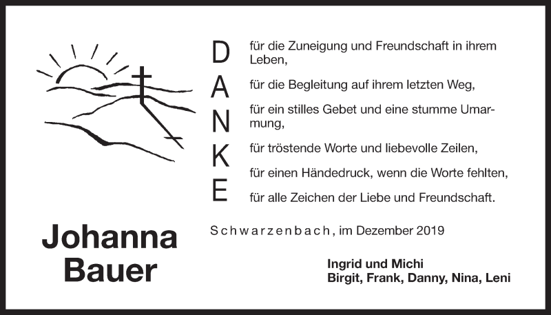 Hier finden Sie alle Traueranzeigen aus der Zeitung, die bisher für Johanna Bauer erschienen sind. Weitere Traueranzeigen, die in der Zeitung erscheinen, werden hier ebenfalls aufgelistet