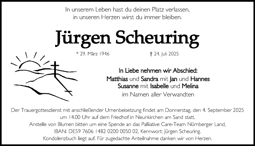 Hier finden Sie alle Traueranzeigen aus der Zeitung, die bisher für Jürgen Scheuring erschienen sind. Weitere Traueranzeigen, die in der Zeitung erscheinen, werden hier ebenfalls aufgelistet
