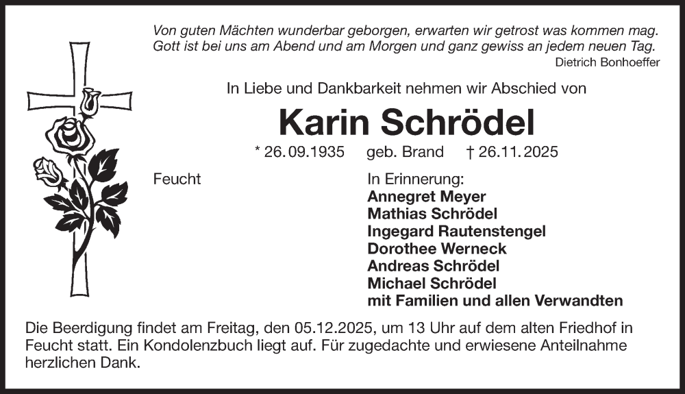 Hier finden Sie alle Traueranzeigen aus der Zeitung, die bisher für Karin Schrödel erschienen sind. Weitere Traueranzeigen, die in der Zeitung erscheinen, werden hier ebenfalls aufgelistet
