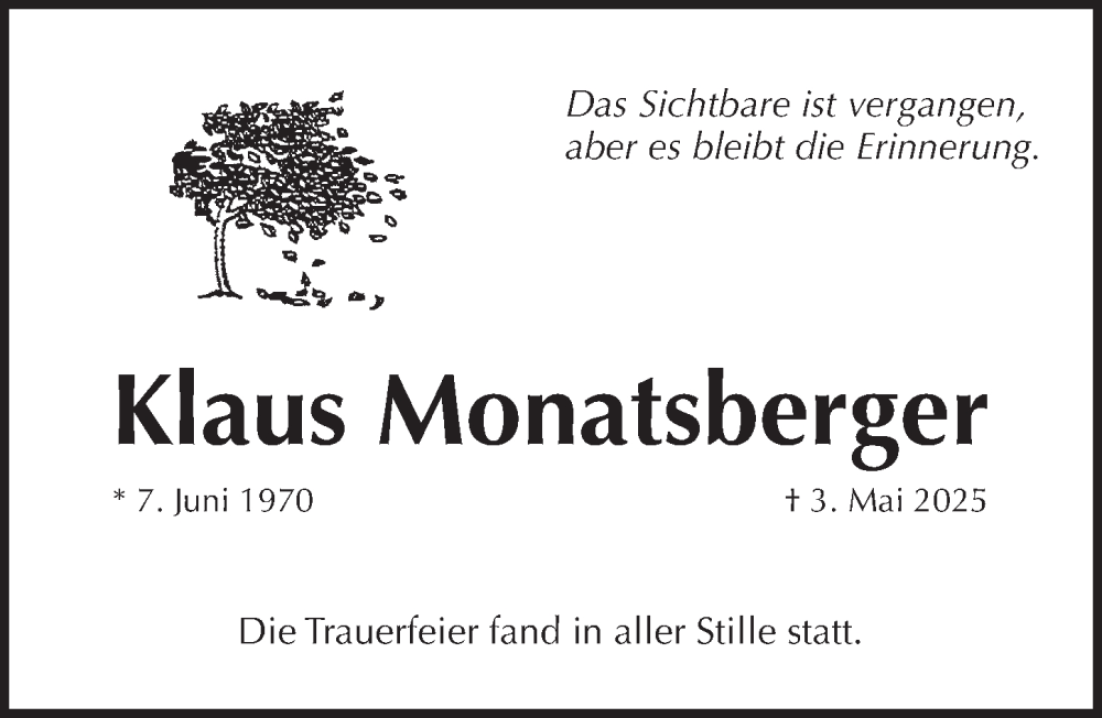 Hier finden Sie alle Traueranzeigen aus der Zeitung, die bisher für Klaus Monatsberger erschienen sind. Weitere Traueranzeigen, die in der Zeitung erscheinen, werden hier ebenfalls aufgelistet