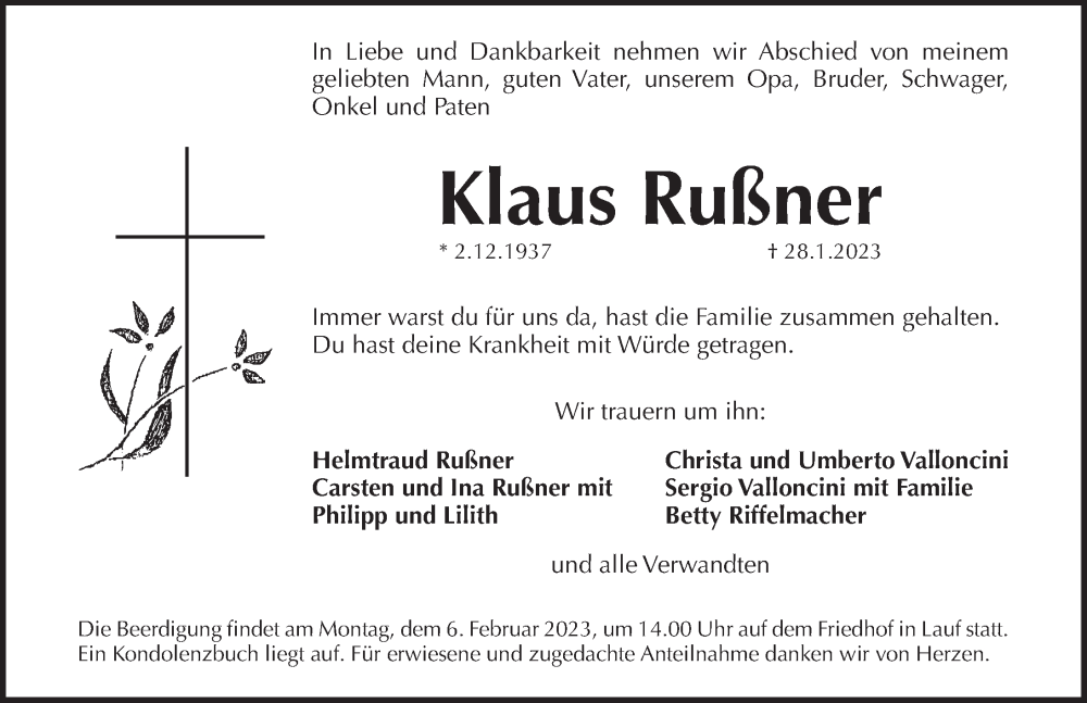 Hier finden Sie alle Traueranzeigen aus der Zeitung, die bisher für Klaus Rußner erschienen sind. Weitere Traueranzeigen, die in der Zeitung erscheinen, werden hier ebenfalls aufgelistet