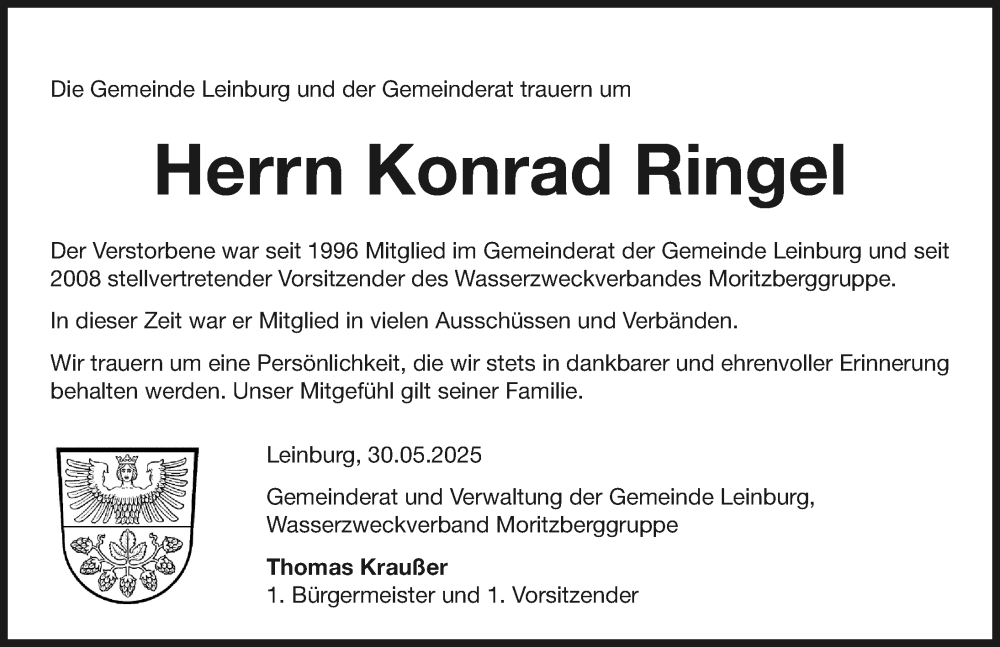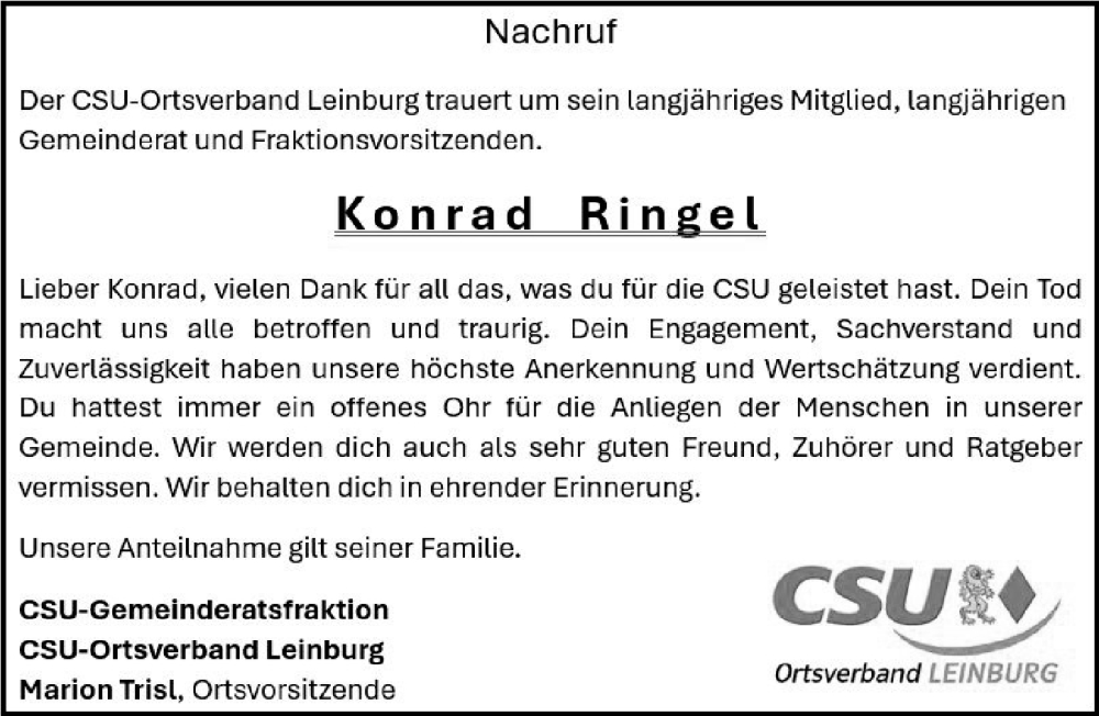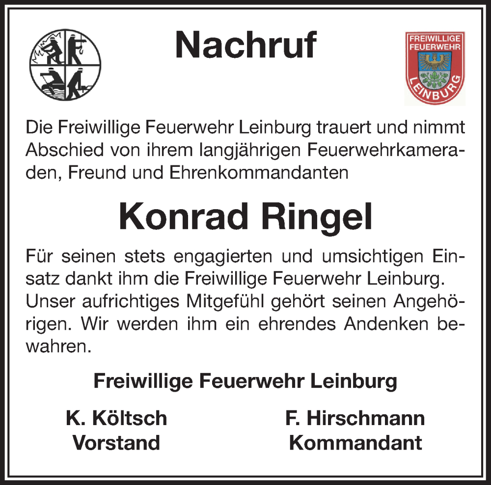 Hier finden Sie alle Traueranzeigen aus der Zeitung, die bisher für Konrad Ringel erschienen sind. Weitere Traueranzeigen, die in der Zeitung erscheinen, werden hier ebenfalls aufgelistet